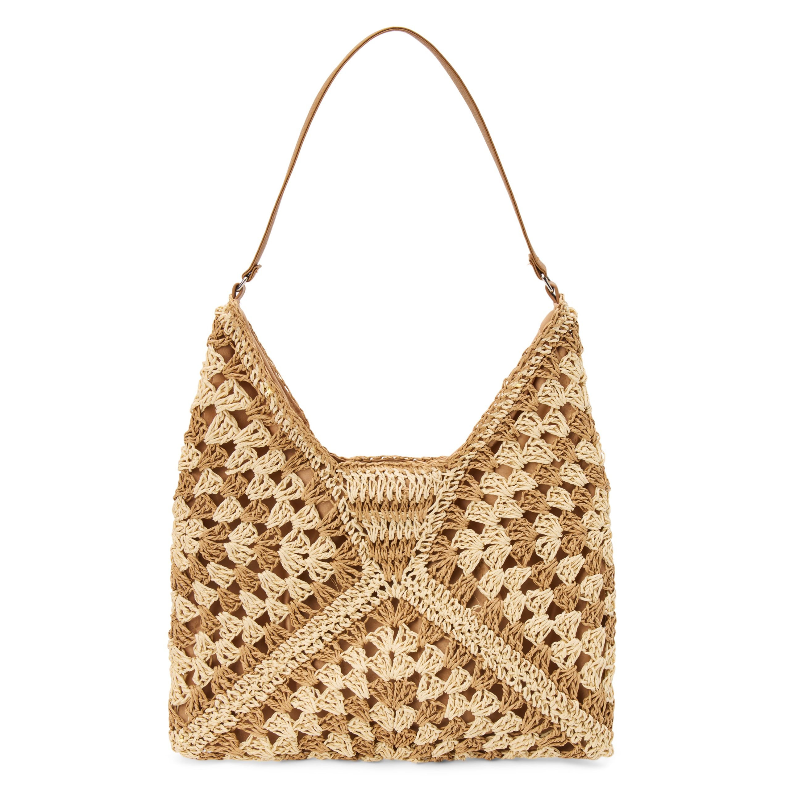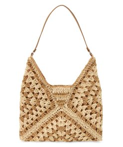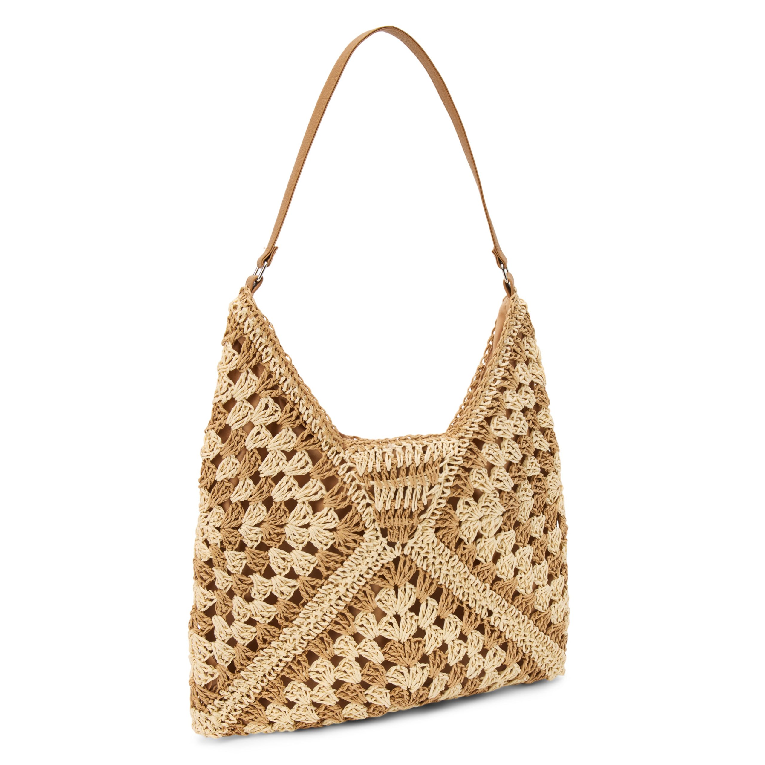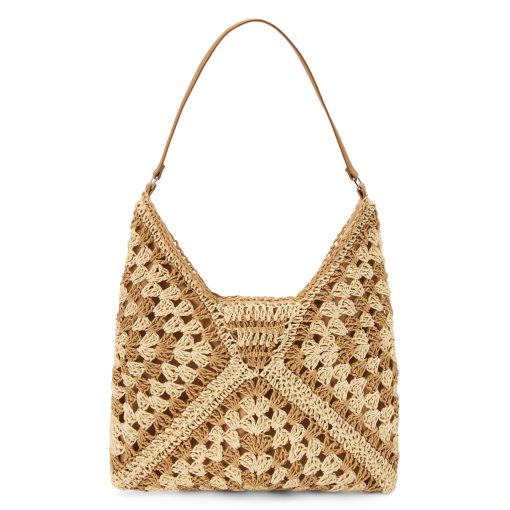 Vegan macramé hobo bag with a geometric granny square design, featuring a synthetic leather shoulder strap for a casual, yet chic look perfect for summer outings or beach days.