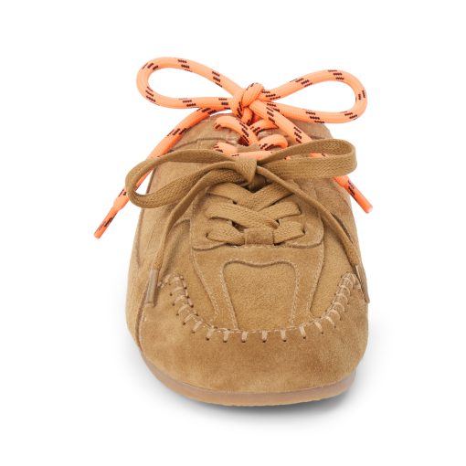Suede mule with moccasin-style stitching, sporty lace-up detail, and open back. A laid-back hybrid silhouette blending slipper comfort with sneaker edge.