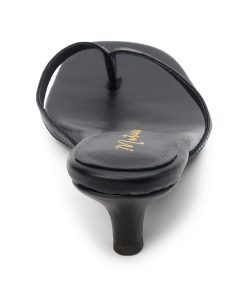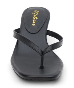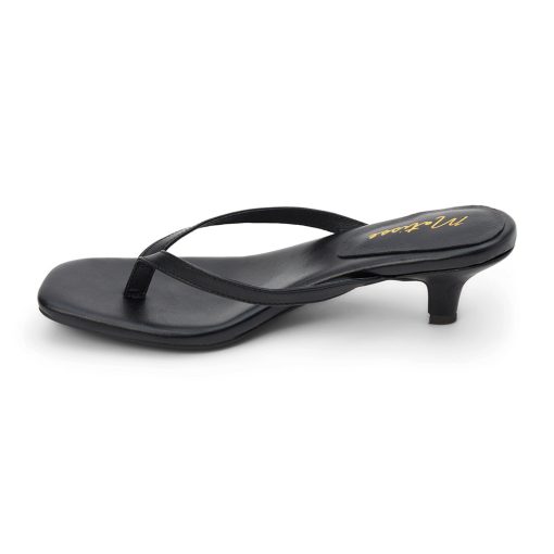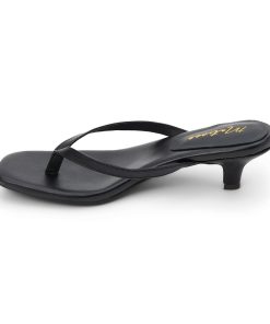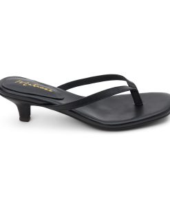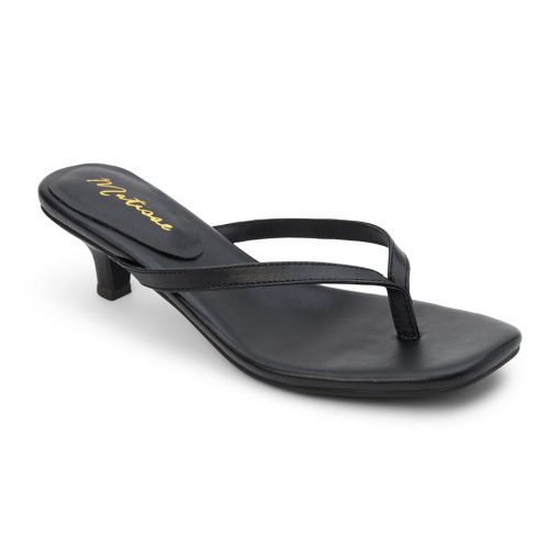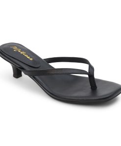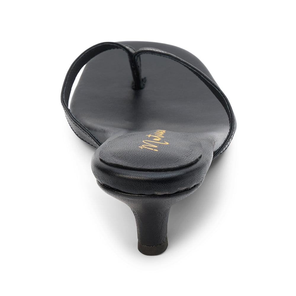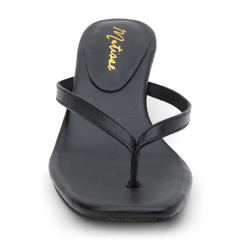 Black leather thong sandals with a square toe, cushioned footbed, and sleek kitten heel. A minimalist yet sophisticated design perfect for effortless day-to-night styling.
