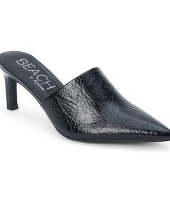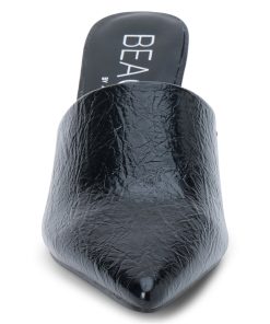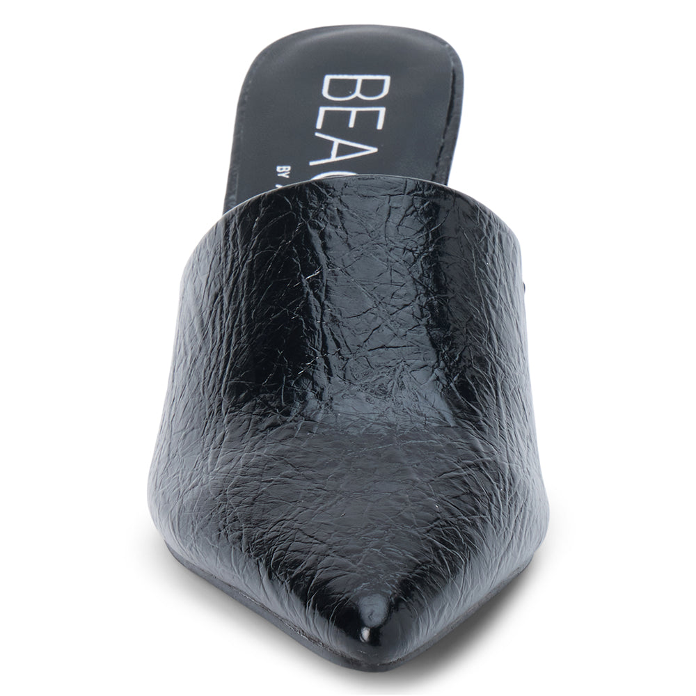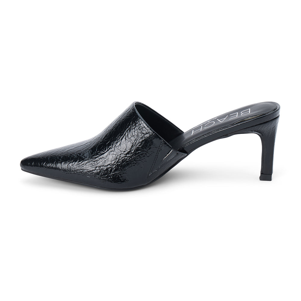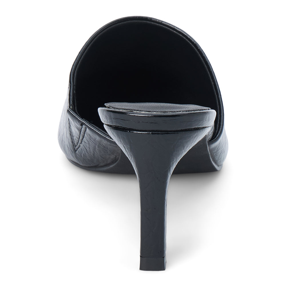Black pointed-toe slip-on mule with textured finish and stiletto heel.