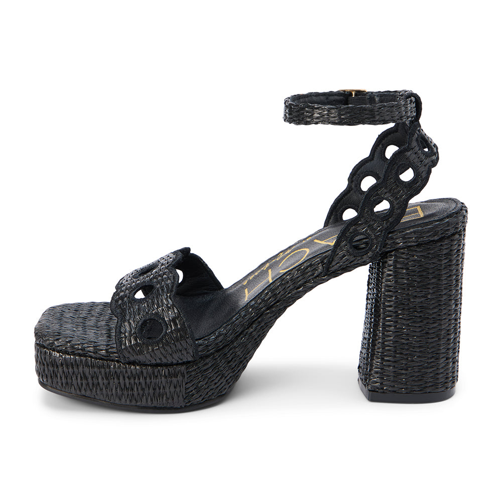 Vegan, platform heeled sandal with scallop and cut-out detail.
