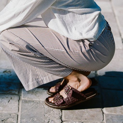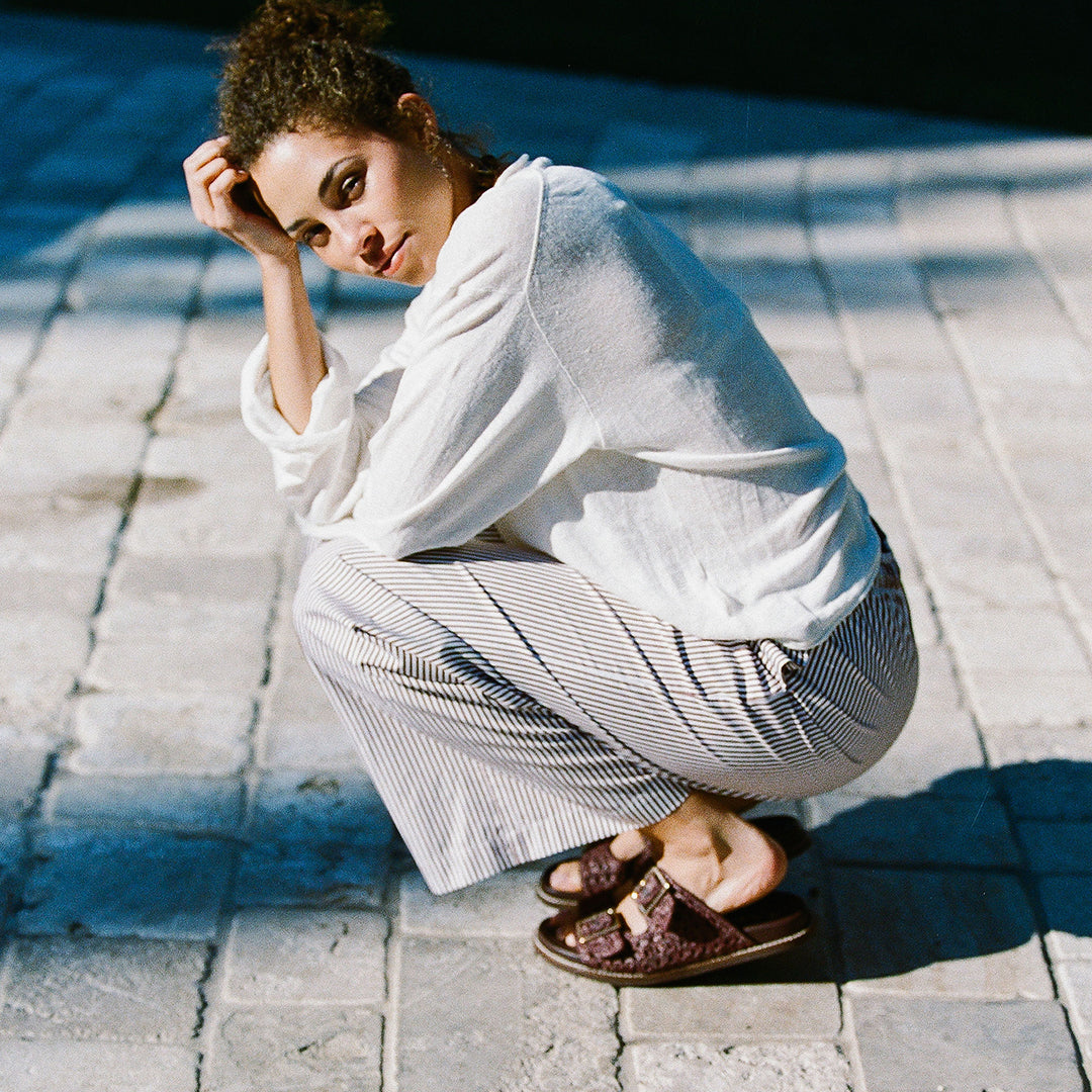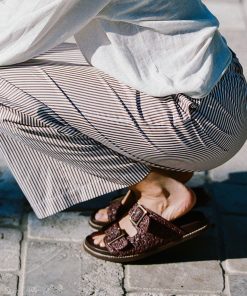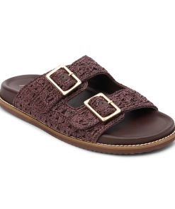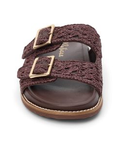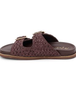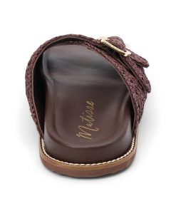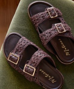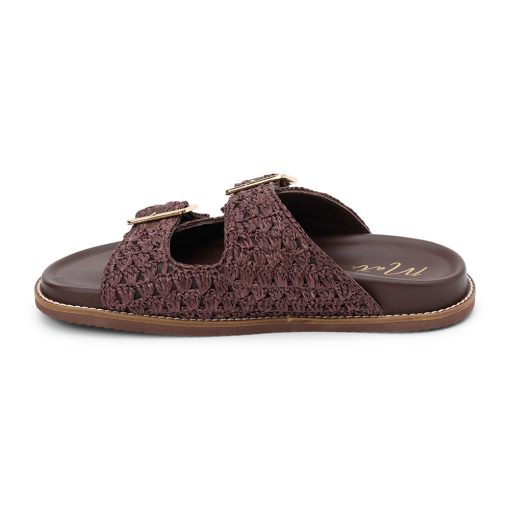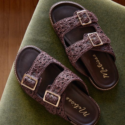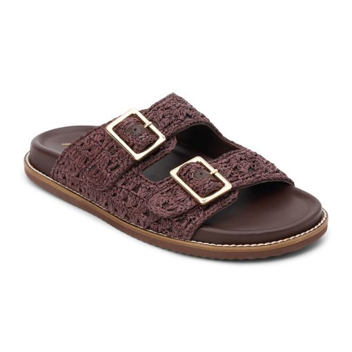 Brown woven raffia slide sandals with adjustable gold-tone buckles, a cushioned footbed, and a sturdy sole. A breezy, laid-back style perfect for warm-weather outings.